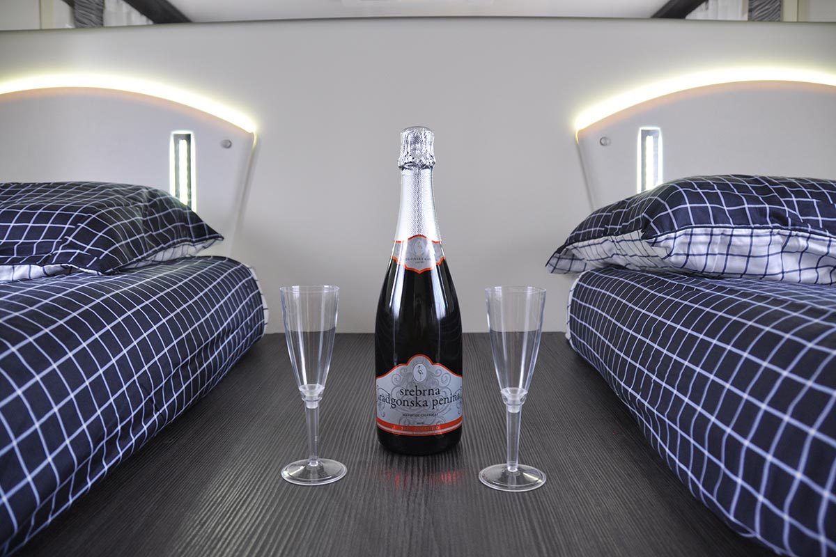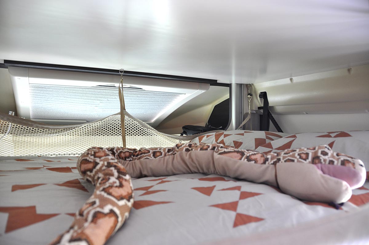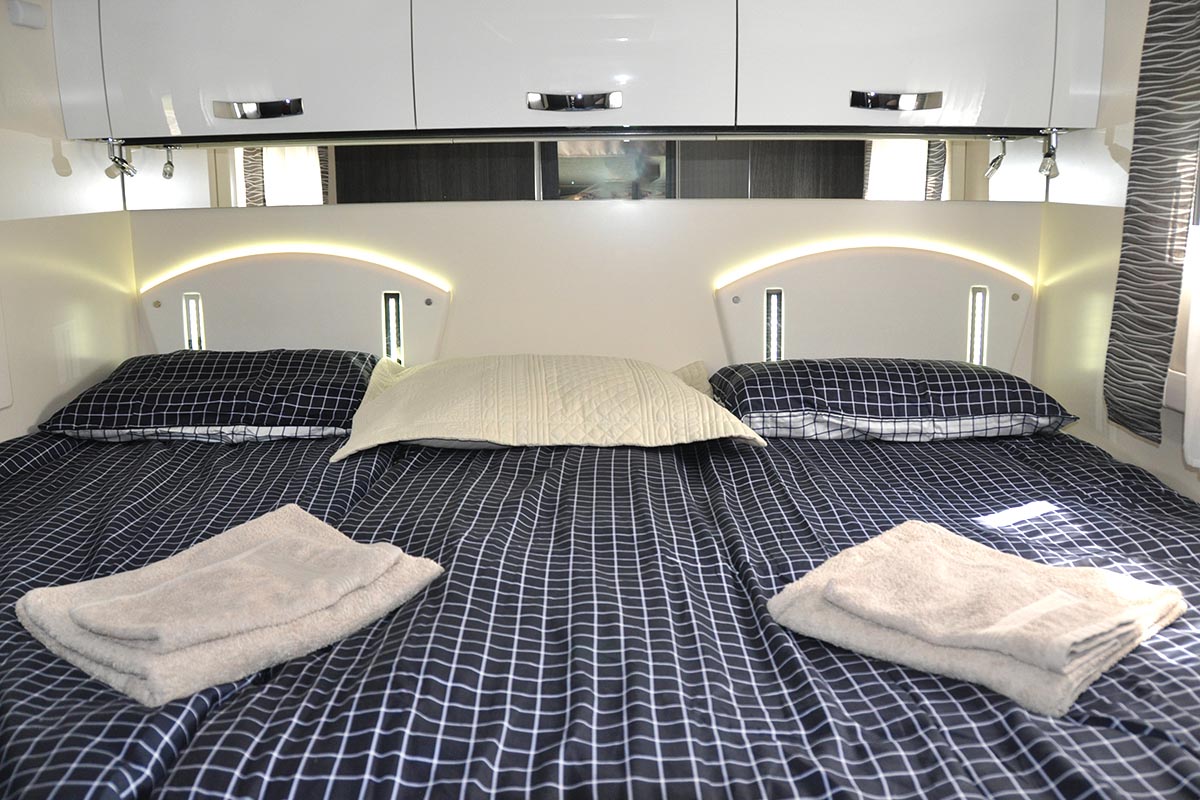 6 ležišč, maxi zakonska postelja zadaj, 5 homologiranih sedežev in ogromna ogrevana garaža. Najraje ga imajo družine in sveta željni popotniki. Moderno zasnovan, izjemno udoben, aerodinamičen, polintegriran zimski avtodom (leto izdelave 2018), el. postelja se spusti s stropa. Ločena WC in tuš ter z vrati ločena prostora v bivalnem delu. Bogato opremljen in z možnostjo izbire veliko dodatne kamp in športne opreme.