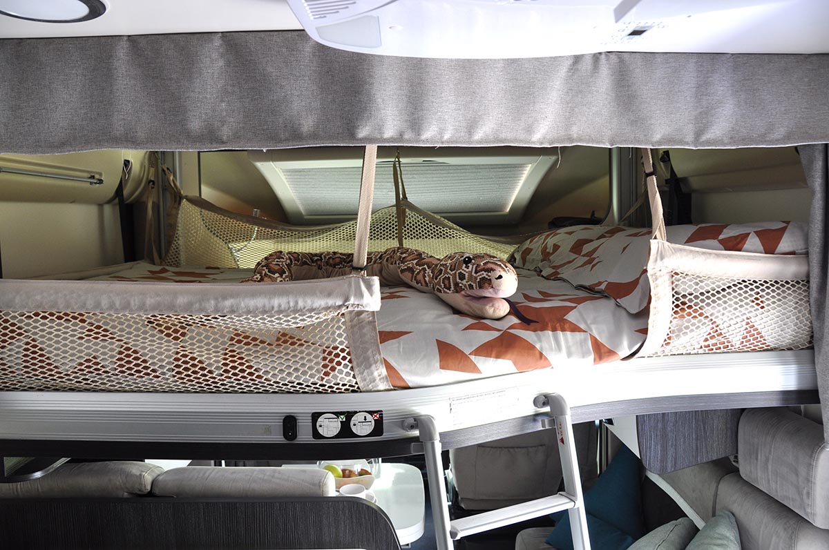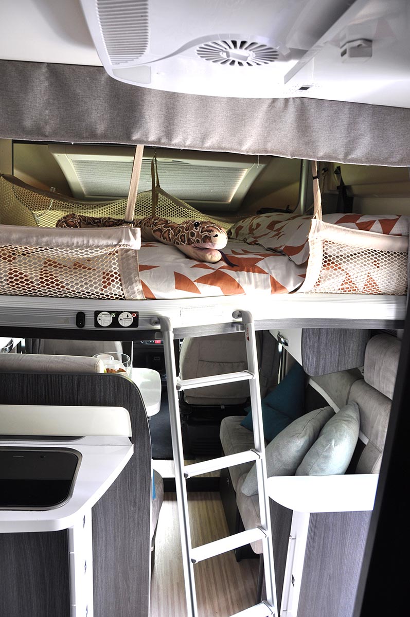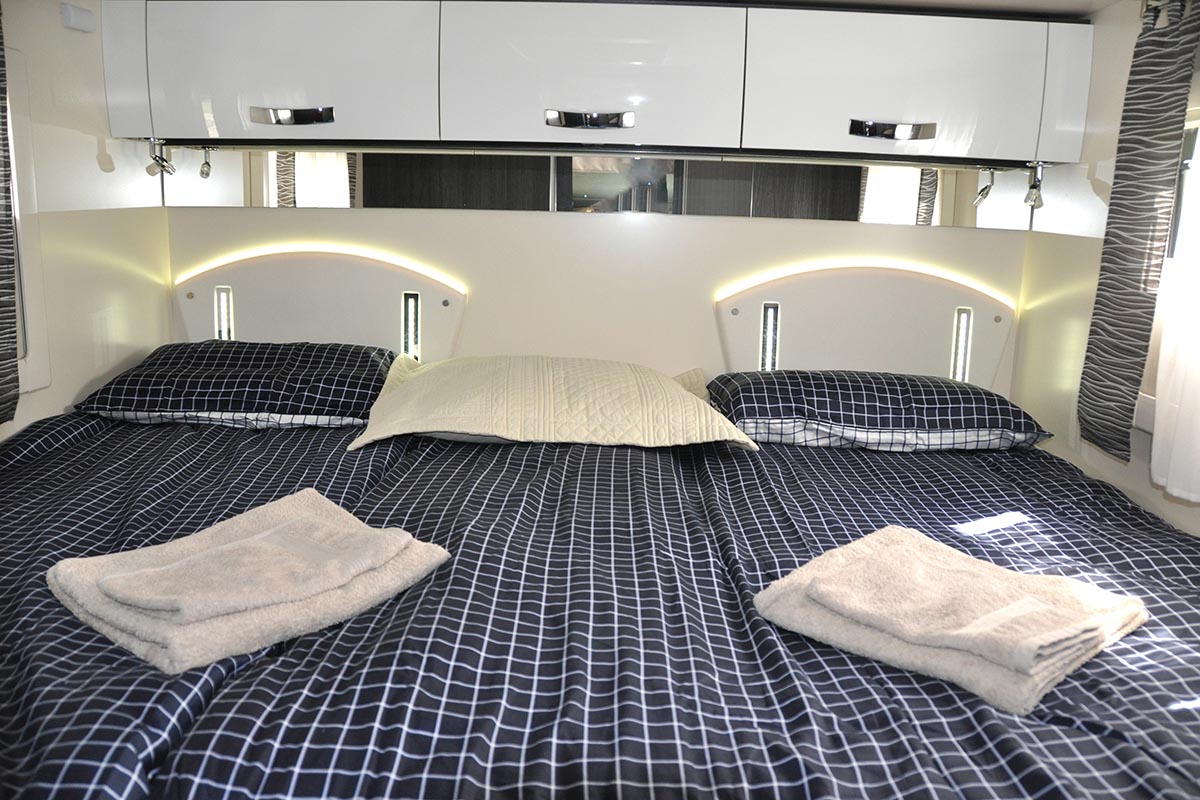 6 ležišč, maxi zakonska postelja zadaj, 5 homologiranih sedežev in ogromna ogrevana garaža. Najraje ga imajo družine in sveta željni popotniki. Moderno zasnovan, izjemno udoben, aerodinamičen, polintegriran zimski avtodom (leto izdelave 2019), el. postelja se spusti s stropa. Ločena WC in tuš ter z vrati ločena prostora v bivalnem delu. Bogato opremljen in z možnostjo izbire veliko dodatne kamp in športne opreme.